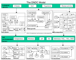 DNDC是农业生态系统中碳和氮生物地球化学的计算机模拟模型。该模型可用于预测作物生长、土壤温度和水分状况、土壤碳动力学、氮浸出以及微量气体的排放,包括一氧化二氮(N2O)、一氧化氮(NO)、氮气(N2)、氨(NH3)、甲烷(CH4)和二氧化碳(CO2)。