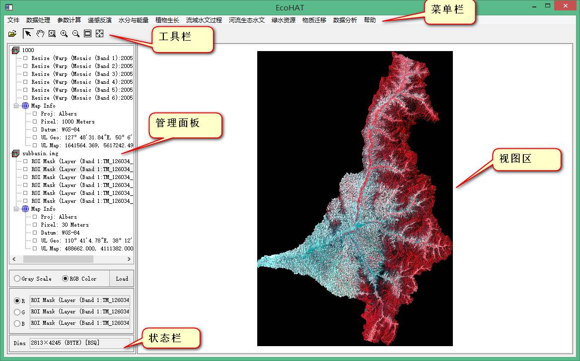 EcoHAT系统以生态水文过程机理研究为基础,从基本的水循环过程入手,在水循环过程中加入营养物质迁移转化过程,综合考虑陆水生态系统中植被/生物生长与水循环要素、营养物质的相互影响。EcoHAT系统的模型构建在综合国内外具有物理化学机制的生态水文过程模型优点基础上,自主创新与国际前沿,经过对模型调整,采用适合中国自然条件的参数,建立本地化的数据库。EcoHAT系统通过区域空间网格参数的输入,实现基于象元的模型运算,因此EcoHAT系统是一个完全分布式的生态水文过程综合模拟的新系统。EcoHAT系统包括水分循环、营养元素循环、植物生长及水生物环境响应四大组成部分,其中水分循环是系统的核心,并贯穿其它三部分的始终。EcoHAT系统中水分循环模拟包括降雨入渗、地表径流、蒸散发、根系吸水和土壤水分五个过程;营养元素循环主要包括土壤中硝化反应、反硝化反应和氨挥发过程模拟,土壤中盐基阳离子循环模拟,以及伴随土壤侵蚀过程产生的吸附态磷元素定量的模拟等;植物生长包括植被生态用水模拟、植被NPP(净第一性生产力)模拟、生产力分配过程模拟和植被营养元素吸收模拟。