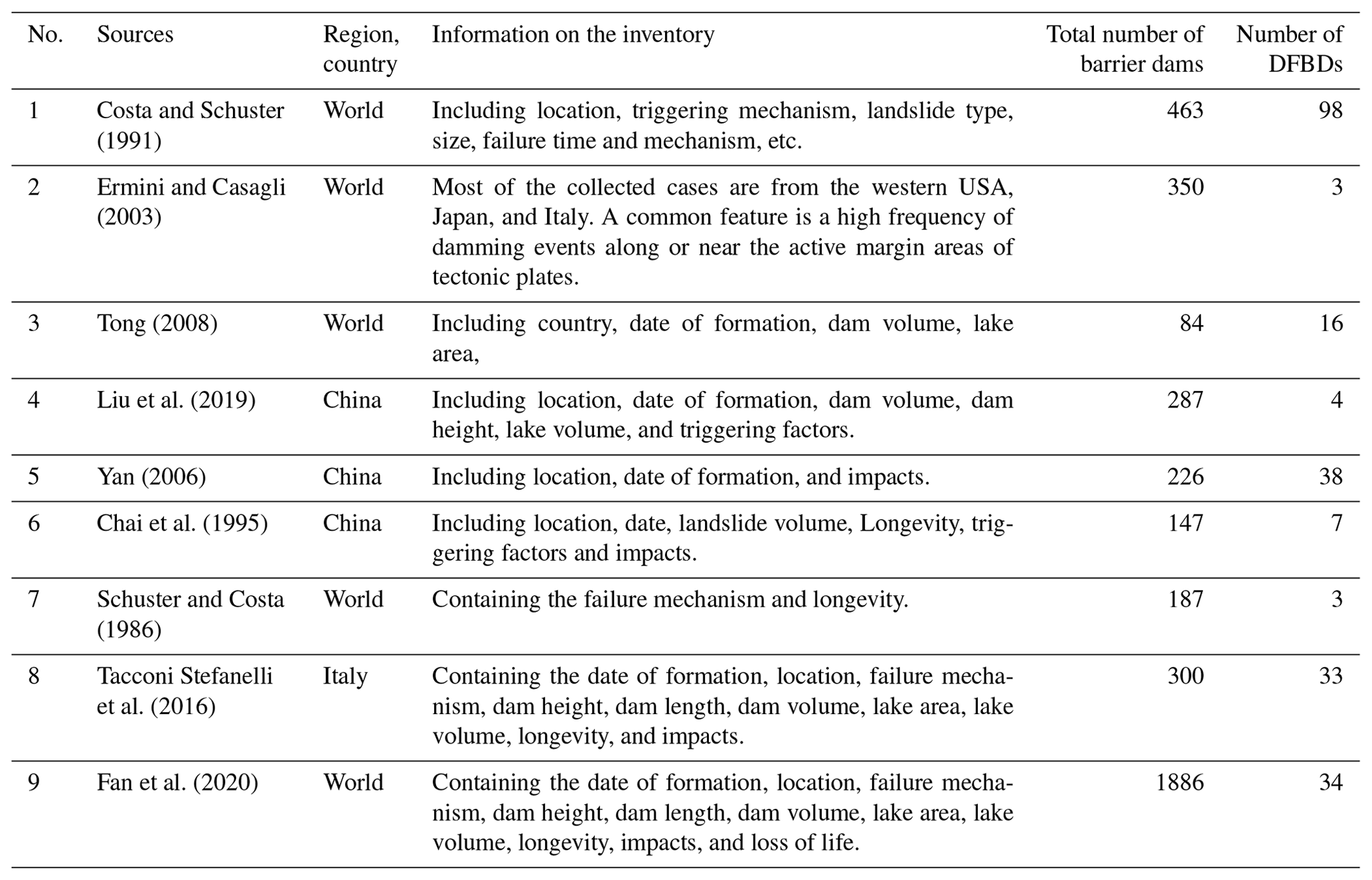 本数据集包含6个类别和38个属性,详细描述了DFBD事件。该数据集记录了基本信息(位置、形成日期等)、坝体特征(高度、长度、体积等)、湖泊特征(面积、容量、长度)、泥石流特征(速度、流量、体积等)、溃坝特征(峰值流量、人员伤亡等)以及气候特征(降水量和温度)数据集表明,DFBDs具有不稳定性、完全堵塞和漫溢失效等关键特征。尤其在中国,此类水坝的数量显著增加,共有15%的河道出现反复泥石流,导致的DFBDs占所有DFBDs的35%。进一步分析表明,在DFBD稳定性评估中,应优先使用Ls(AHV)模型,其次为DBI模型。与其他障碍坝数据集相比,本数据集更具针对性,强调对原始数据的审查,并强调术语和概念(即堵塞模式和稳定性)的统一,以确保数据的一致性和准确性。本研究中的数据集和结果可能有助于加深对DFBD形成、分布和演化的理解。