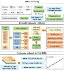 结合陆地/海洋遥感数据与模型模拟,基于开发和测试的堆叠机器学习方法,重建了2000至2020年间空间分辨率为0.05°的全球连续8天XCO2(干空气二氧化碳柱平均摩尔分数)产品(GCXCO2)。GCXCO2产品与OCO-2卫星观测具有相似的空间分布特征,但实现了全球无缝覆盖,其空间分...