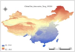 ChinaClim_timeseries 包含中国 1952-2019 年期间的逐月平均气温数据集,空间分辨率为 1km,该数据是基于气候学辅助插值(CAI)将月度异常面和基线气候学面(ChinaClim_baseline)叠加生成的。数据的比例因子为 0.1。