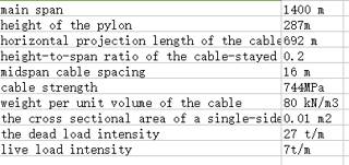 该数据集为示例斜拉桥的基本设计参数,包含斜拉桥跨径,塔高,荷载值,拉索强度等参数。通过这些数据去验证本文提出的近似方法的适用性,近似计算的结果非常接近数值分析的结果,证实了论文提出的近似方法的有效性。