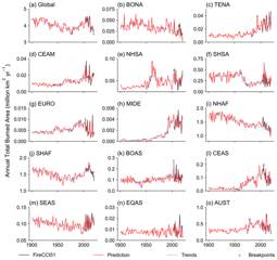 本数据集为全球月度0.5°×0.5°过火面积比例数据集,覆盖时段为1901年至2020年。数据基于气候条件、植被状态、人口密度和土地利用数据,通过机器学习模型重建生成,旨在提供20世纪时空一致的过火面积数据,以弥补卫星观测时间覆盖短和模型模拟不确定性大的不足。数据集包含三个版本:基于...