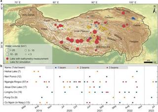 基于ICESat-2激光雷达测高仪数据及自仿射理论推导的经验方程,估算了2022年青藏高原面积大于0.01 km²的湖泊体积。研究发现模拟湖泊体积与实地测量值吻合良好,最大湖深的平均绝对百分比误差为8.0%,湖泊体积的平均绝对百分比误差为19.7%。据估算,2022年青藏高原面积大于0.01 km²的湖泊总...