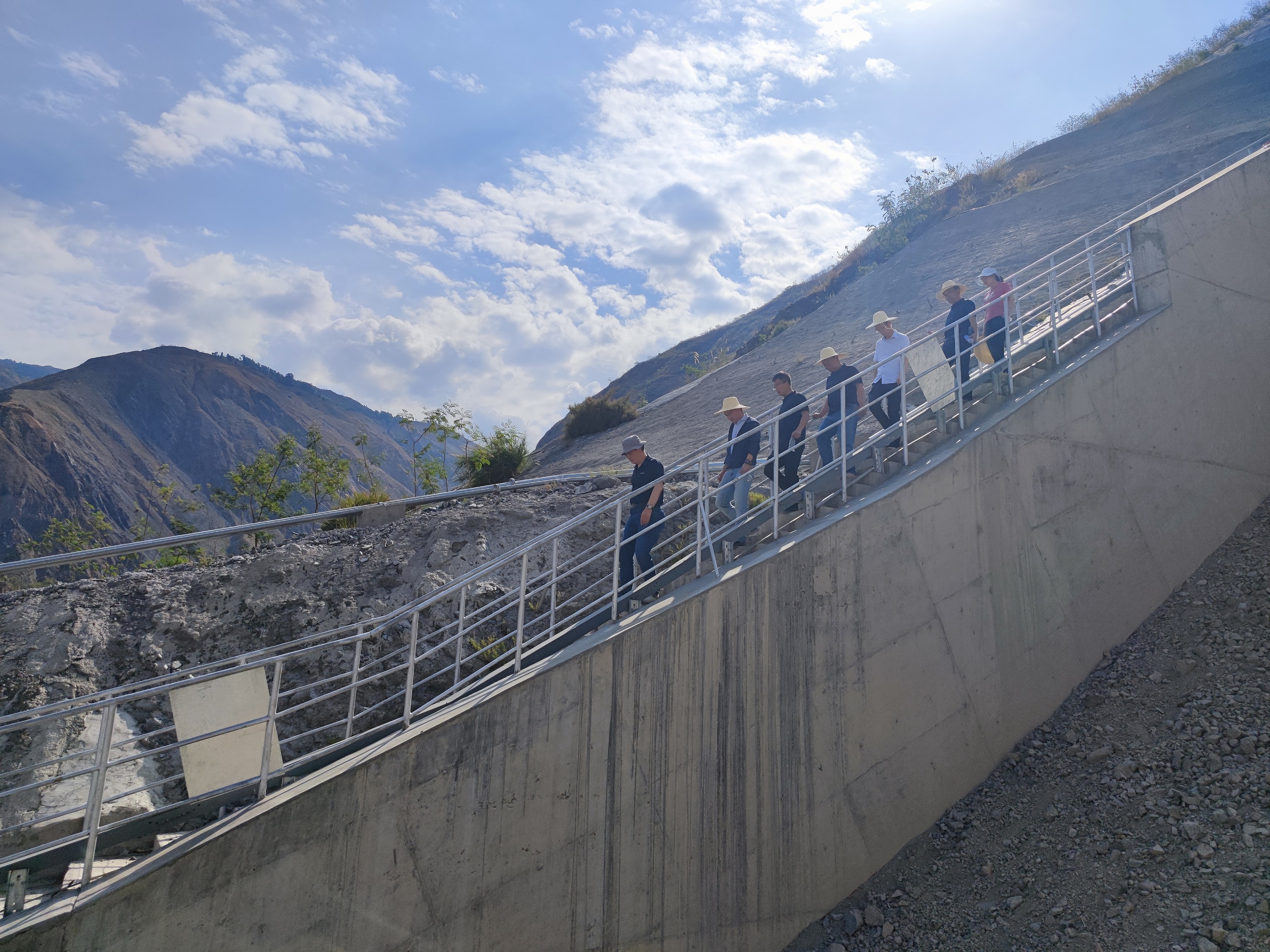 在宋东日研究员的引领下,康世昌首先实地查看了蒋家沟泥石流原位监测设施及野外实验场。期间,宋东日研究员详细介绍了东川站在蒋家沟布设的泥石流监测网络以及相关观测项目,康世昌所长认真听取介绍,详细询问了监测工作的细节和成效。
