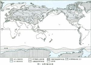 积雪是冷圈中分布最广泛、年际变化和季节变化最显著的一员。地球每年有11500万~12600万 km的面积被雪覆盖过,占地球表面积的23%,其中2/3覆盖在陆地上,1/3覆盖在海冰上。同时有积雪的平均面积为6150万 km,12月和1月面积最大,达 79×10平方公里,占地表面积的 15%;7月和 8月面积最小,仅43×10平方公里,约占地表面积的8%。在观测台站视野范围内,地面1/2以上的面积被雪覆盖就可认为是积雪天气现象。陆地上的积雪区分为永久积雪区和季节积雪区。季节积雪区在冬季形成,夏季消失。全球被积雪覆盖的总面积每年约为12600万km,其中2/3是在陆地上,1/3在海冰上。永久积雪区约为1700万km,其中南半球约为1290万km,北半球约410万km。积雪分布具有地带性规律。从两极到中低纬度依次为:永久积雪区,季节积雪区和无积雪区。山地积雪垂直地带性分布与此类同。地球上永久积雪区大约有17.2×10平方公里,占陆地面积的11%,是现代冰川发育的摇篮。主要分布在南极大陆、格陵兰、北冰洋西部岛屿以及中低纬度高山地区。中国积雪多出现的面积达900 km,积雪厚度最大20~30 cm,西部山区最大达80~90 cm。中国永久积雪区约5.65万km,呈散状分布在西部高山现代冰川作用区。稳定季节积雪区面积有 420×10平方公里,主要包括东北、内蒙古东部和北部、新疆北部和西部、青藏高原区。不稳定季节积雪区南界位于北纬25°~24°。无积雪地区仅包括福建、广东、广西、云南四省(区)南部、海南省和台湾省大部分地区 [4] 。