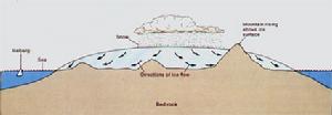 在一个畅通的山谷中,冰川流动时最大流速出现在冰川表面,愈近谷底速度降低,这种运动方式叫做重力流。如果冰川运动过程中,在前方遇到突起的基岩或运动变缓的冰块的阻塞,就在那里形成前挤后压的剪应力,这种流动方式叫做阻塞重力流。在发生阻塞重力流的地方,冰中常有许多逆断层,还有复杂的褶皱出现。