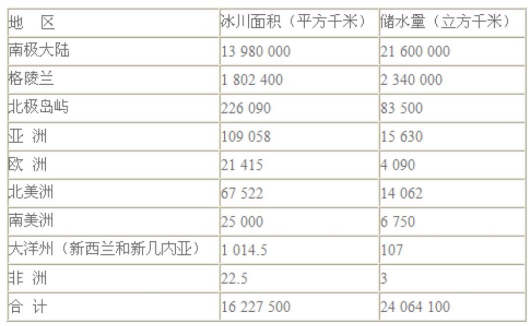 北极(格陵兰) 总面积2166086km²,冰占总面积81%。已知冰川面积1755637km²,冰川总体积2850000km³。