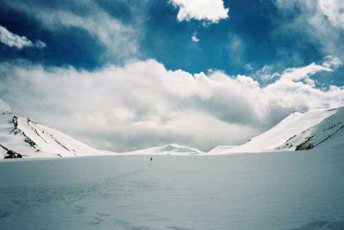**粒雪盆:**雪线以上的区域,从天空降落的雪和从山坡上滑下的雪,容易在地形低洼的地方聚集起来。由于低洼的地形一般都是状如盆地,所以在冰川学上称其为粒雪盆。粒雪盆是冰川的摇篮。聚积在粒雪盆里的雪,究竟是怎样变成冰川冰的呢?雪花经过一系列变质作用,逐渐变成颗粒状的粒雪。粒雪之间有很多气道,这些气道彼此相通,因此粒雪层仿佛海绵似的疏松。有些地方的冰川粒雪盆里的粒雪很厚,底部的粒雪在上层的重压下发生缓慢的沉降压实和重结晶作用,粒雪相互联结合并,减少空隙。同时表面的融水下渗,部份冻结起来,使粒雪的气道逐渐封闭。被包围在冰中的空气就此成为气泡。这种冰由于含气泡较多,颜色发白,容重约为0.82~0.84克/立方厘米,也有人把它专门叫做粒雪冰。粒雪冰进一步受压,排出气泡,就变成浅蓝色的冰川冰。巨厚的冰川冰在本身压力和重力的联合作用下发生塑性流动,越过粒雪盆出口,蜿蜒而下,形成长短不一的冰舌。长大的冰舌可以延伸到山谷低处以至谷口外。发育成熟的冰川一般都有粒雪盆和冰舌,雪线以上的粒雪盆是冰川的积累区,雪线以下的冰舌是冰川的消融区。二者好像天平的二端,共同控制着冰川的物质平衡,决定着冰川的活动。雪线正好相当于天平的支点。