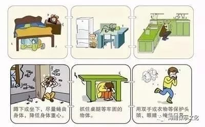 ★身体应采取的姿势。伏而待定,蹲下或坐下,尽量蜷曲身体,降低身体重心; 抓住桌腿等牢固的物体; 保护头颈、眼睛、掩住口鼻; 避开人流,不要乱挤乱拥,不要随便点灯火,空气中有易燃易爆气体。