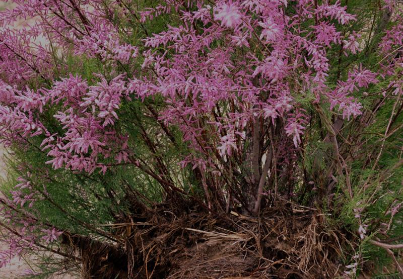 【根】沙生植物在被沙掩埋的茎和枝条上能形成不定根,在被风吹露的根上能形成不定芽和枝。主根扎得深,侧根铺得广,而地上部分则大大缩小。一株不足半米高的白刺,它的很深达3米多,主根长13米,侧根长6米以上,根幅14米,根深为株高的7倍以上。梭梭的主侧根也很发达,它的根系长度是地上部分高度的5~7倍。沙拐枣的垂直根系较浅,水平根系则长达十几米,只要地面上有一点点水分,它就能充分吸收。根通常不深,侧根强烈发育,向外延伸可达十几米远,如沙拐枣(Callygonum),高不到1米,但侧根向外延伸可达十几米远。这种强烈发育的侧根一方面可以起到固定作用,另一方面可以充分吸收近地面水分。另外,许多沙生植物的根上具有沙套,可以保护植物的根免受灼伤、干燥以及沙粒的机械损伤。这种沙套是由根的外层分泌的液体粘结沙粒形成的,如沙芦草(Agropyron mongolicum)的根就具有这种沙套。