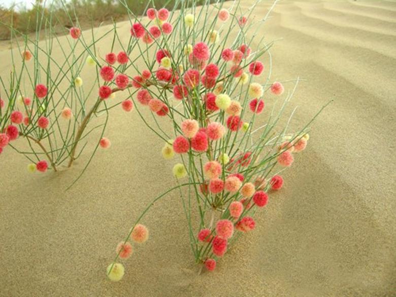 【沙生植物】 提起沙漠,有人总以为那里是荒凉无际,黄沙滚滚,寸草不生。其实,沙漠并不是生命的禁区,那里尚有片片绿洲呈现着生机。生活在以沙粒为基质的沙区的植物被称为沙生植物。这些沙生植物由于长期生活在风沙大、雨水少、冷热多变的严酷气候下,练就了一身适应艰苦环境的本领,生就了种种奇特的形态。它们那顽强的生命力,令人惊异。