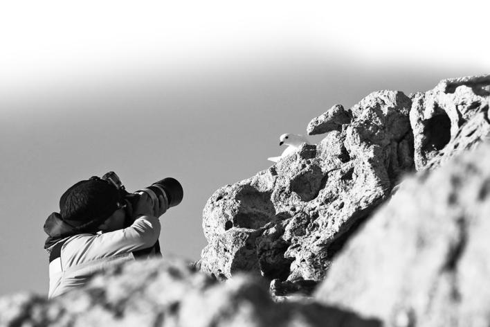 2018年12月初,考察队乘“雪龙”船抵达中山站。一天傍晚,记者随张正旺登上站区附近的小山寻找雪鹱巢穴。地平线上,南极极昼的太阳悬于天际,地面上的冰雪反射着刺眼的白光。忽然,山崖间闪过几个白色的身影,它们互相追逐,有时还发出尖锐的鸣叫。那正是雪鹱配对求偶时在表演炫技飞行。